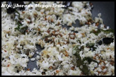 In a pan, heat the coconut oil, add the asafoetida, then the urad dhal, then the mustard seeds, the jeera, dry red chillies and the curry leaves for tempering.